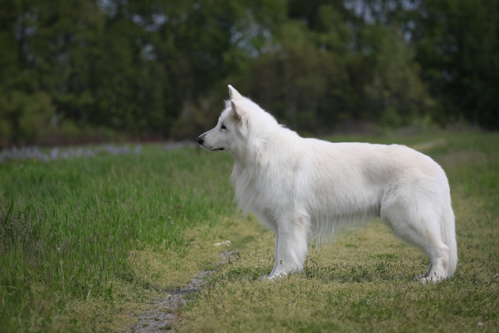 A powerful, well-muscled, medium-sized, White Shepherd dog with erect ears, double coat which is either of medium length or long; elongated shape; medium sized bone and elegant, harmonious outline